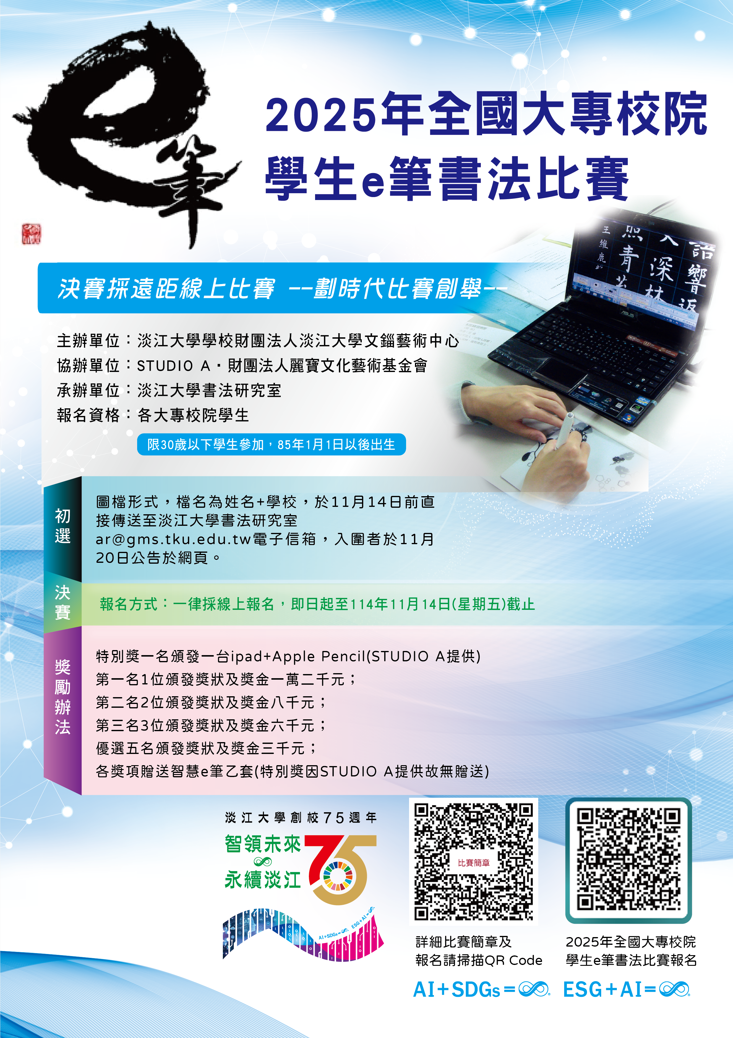 四、報名方式:採線上報名,自即日起至114年11月14日(星期 五)止。相關訊息請參閱比賽簡章或至旨揭研究室網頁 (http://calligraphy.tku.edu.tw/)最新消息/比賽訊息查 詢。