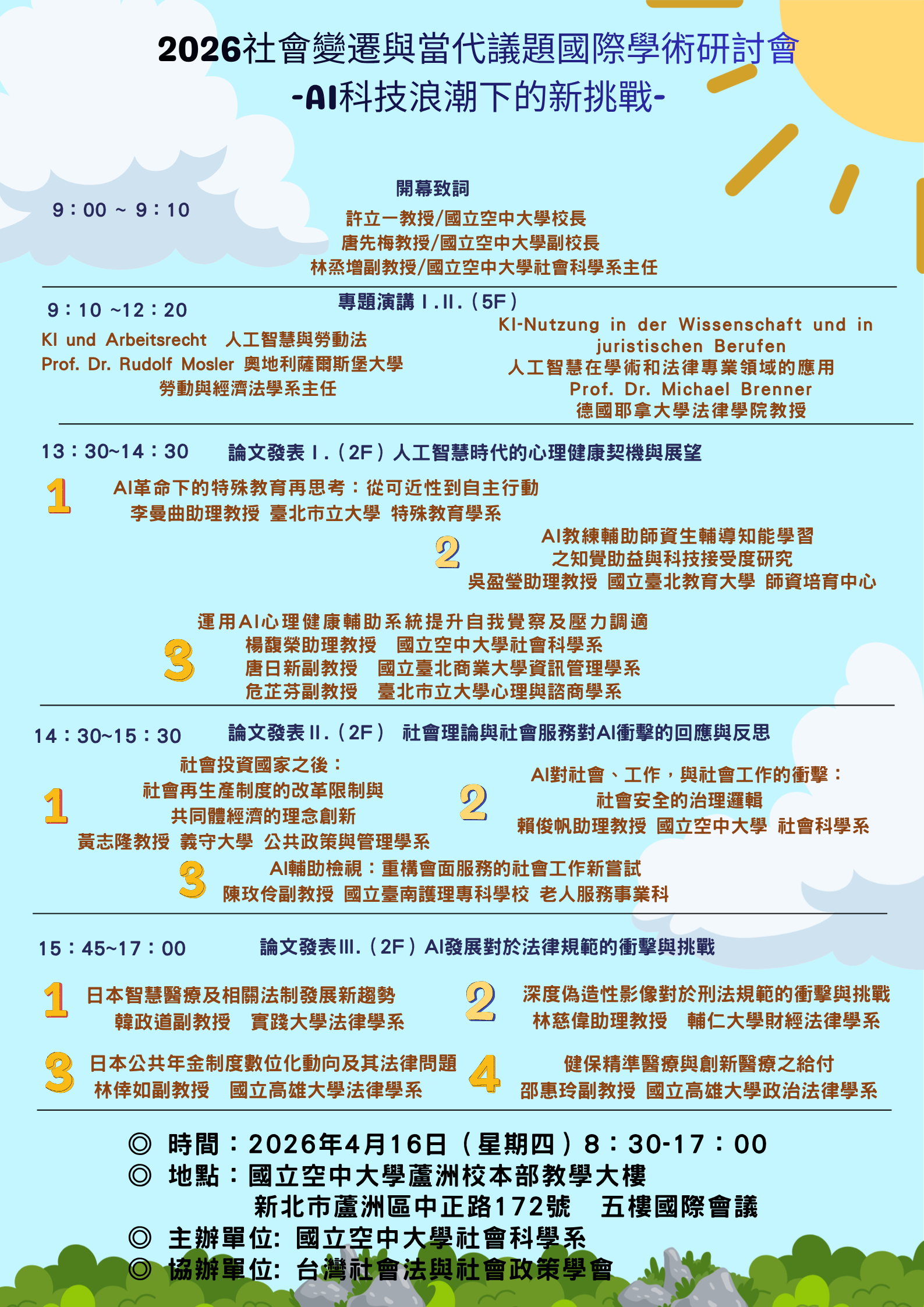 一、本校社會科學系與台灣社會法與社會政策學會於中華民國 115年4月16日(星期四)8時30分至17時,在本校校本部教 學大樓五樓國際會議廳及二樓智能會議室,合辦旨揭國際 學術研討會,本次特別邀請奧地利薩爾斯堡大學勞動與經 濟法學系主任Prof. Dr. Rudolf Mosler,和德國耶拿大學 法律學院教授Prof. Dr. Michael Brenner蒞校專題演 講。
